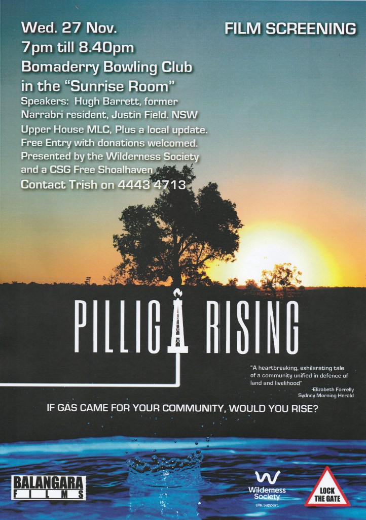 We also had MLC Justin Field table our petitions later asking the upper house to rule out Future CSG Exploration in the Shoalhaven and it Passed… so our area is safe for now, with many thanks to everyone who helped make this happen! but CSG is still a threat in NSW with the Narrabri Gas Project looming and CSG wells still operating near homes in the Camden area of Spring Farm and Mount Annan until 2023, some wells, within 100 meters of homes Screening details; Wednesday the 27th of November, 7pm till 8.40pm at the Bomaderry Bowling Club, 154 Meroo Road, Bomaderry in the Sunshine Room. Hugh Barrett and Justin Field will provide current information on Coal Seam Gas in NSW and the Narribri Gas Project. A Q&A follows after the film. Entry is Free with Tea and Coffee by Donation to Help Cover Costs. Any profit from the evening will go to the Wilderness Society.