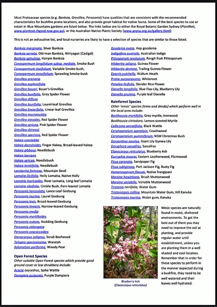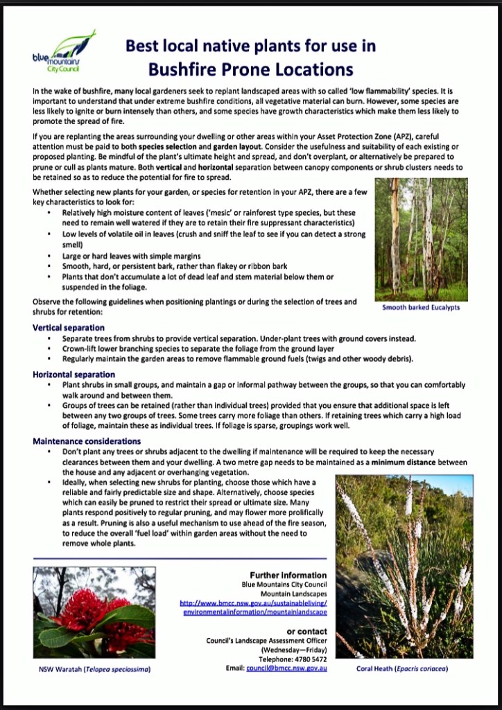 So I have attached a Blue Mountains City Council pamphlet informing residents of appropriate trees to plant in fire prone areas which might be useful in dealing with the aftermath response to the fires.