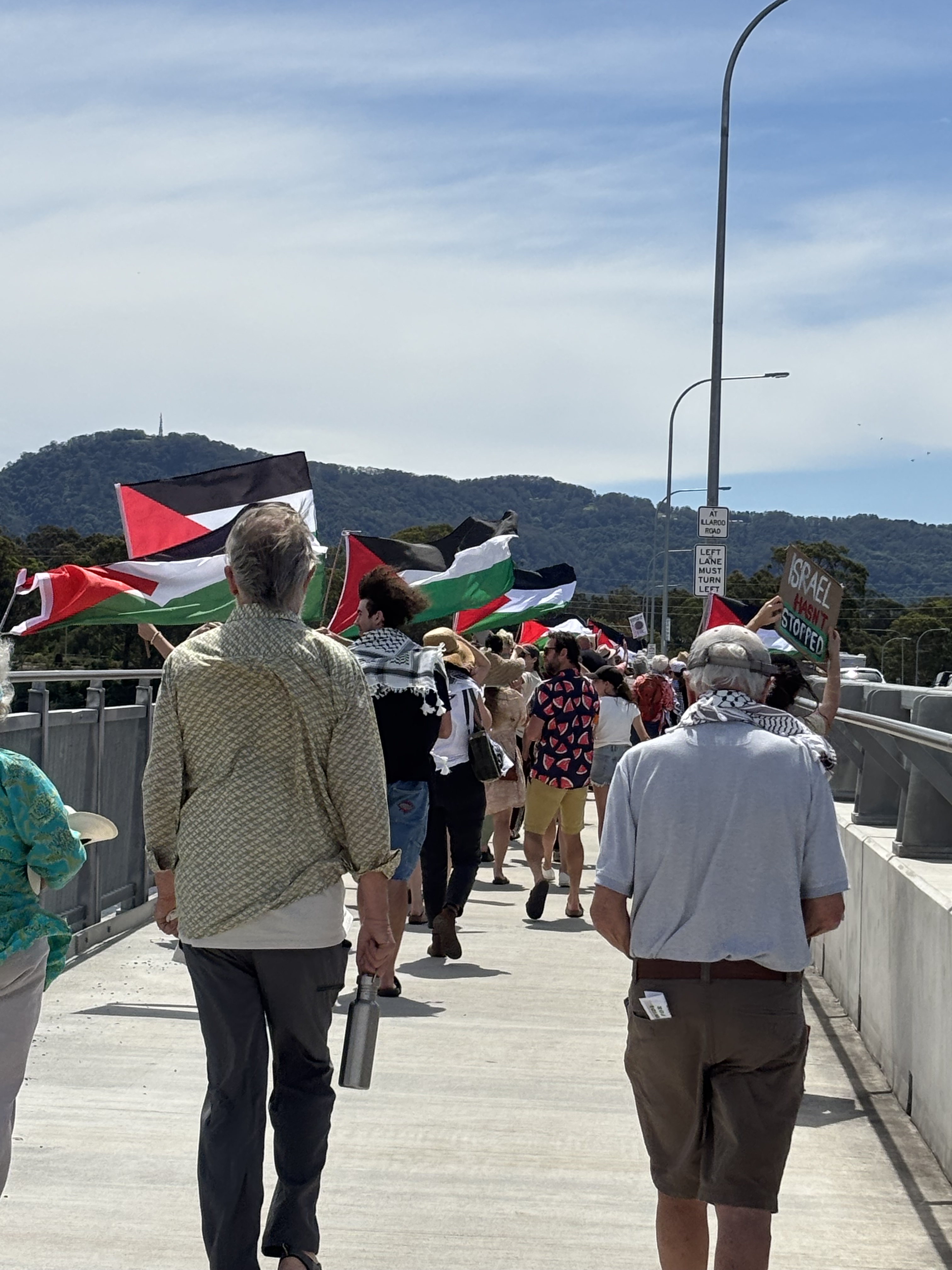 More than 300 people marched across Nowra Bridge to support the people of Palestine. While a ceasefire has been agreed, the battle for justice has only just begun. Many thanks to everyone who attended and to Shoalhaven Friends of Palestine for all their hard work in organising the event.